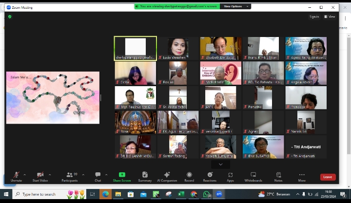 Doa Rosario Pencinta Kehidupan dilaksanakan secara online via zoom. Kali ini Renungan dibawakan langsung oleh Ketua Komisi Keluarga KWI, Mgr Paulinus Yan Olla, MSF. Kurang lebih 100 orang dari seluruh Indonesia bergabung dalam rosario ini. FKPK telah melayani sejak tahun 1998, “fokus perhatian FKPK pada janin yang tidak diinginkan. FKPK mendampingi, memberi konseling dan membantu menemukan solusi supaya bayi tidak diaborsi. FKPK bekerja secara berjejaring. Jadi apabila ada seorang ibu mengalami KTD(Kehamilan Tak Diinginkan) maka kami kaji mengapa, agar dapat dicari solusinya. Apabila memerlukan tempat tinggal dicarikan tempat tinggal. Kemudian apabila perlu pelayanan kehamilan, persalinan juga dibantu. Dicarikan tempat tinggal sementara sampai ibunya siap merawat bayinya,” kata dr Angela Wakil Ketua FKPK. “Tiap tgl 25 maret kami mendoakan doa rosario pencinta kehidupan. Tahun ini suster-suster karmelit juga melakukan hal yang sama. Ada suster suster karmelit juga mendoakan rosario ini pada jam 20 hari ini.”